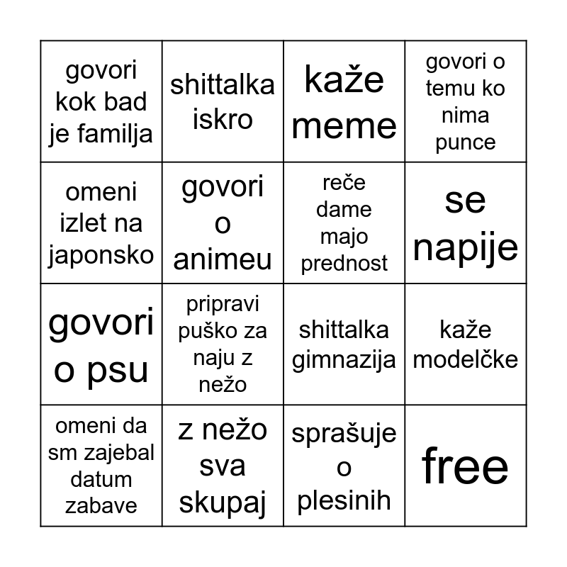 This bingo card has 16 words: z nežo sva skupaj, kaže modelčke, kaže meme, govori kok bad je familja, govori o psu, shittalka iskro, shittalka gimnazija, sprašuje o plesinih, omeni izlet na japonsko, govori o animeu, omeni da sm zajebal datum zabave, govori o temu ko nima punce, pripravi puško za naju z nežo, se napije, reče dame majo prednost and free.