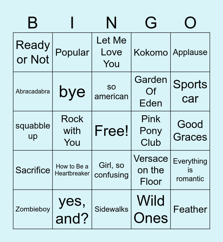 This bingo card has a free space and 162 words: My Girl, Didja Know, Closer, Airplanes, Nothin' on You, Rocketeer, Style, No Hands, No Scrubs, My Boo, Abracadabra, Miss Independent, Let Me Love You, Love Me Harder, Versace on the Floor, One Last Time, Still into You, Misery Business, Ain't it Fun, Break Free, Complicated, Can't Feel My Face, Your Love Is My Drug, Don't, You Need Me, I Don't Need You, Hurricane, Ready or Not, Maps, Stitches, Drag Me Down, DJ Got Us Fallin' In Love, TiK ToK, We R Who We R, Vanish Into You, I Can Do It With A Broken Heart, august, mirrorball, invisible string, Witchy, 360, Sports car, BIRDS OF A FEATHER, CHIHIRO, L'AMOUR DE MA VIE, Illusion, Gemini, no tears left to cry, Sunday Morning, Taste, All The Stars, Messages from the Stars, Fireflies, I Hear a Symphony, Chateau (Feel Alright), Vincent (Starry, Starry Night), Wild Ones, Another life, Mosquito, Nonsense, Juno, Feather, Please Please Please, Good Graces, How to Be a Heartbreaker, Bed Chem, the boy is mine, Espresso, Hard Times, Getaway Car, yes, and?, supernatural, Pink Pony Club, bye, You Belong With Me, HOT TO GO!, Delicate, Von dutch, Club classics, Busy Woman, so american, bad idea right?, Wildest Dreams, Rush, Bejeweled, Karma, Miss Americana & The Heartbreak prince, Enchanted, Down Bad, I Knew You Were Trouble, Applause, Lover, Blank Space, Judas, Our Song, Dance The Night, Training Season, Houdini, Red, Paper Rings, Fearless, Call It What You Want, Daylight, We Are Never Ever Getting Back Together, willow, Garden Of Eden, Zombieboy, Best Song Ever, Take Me Back To LA, Real Love, In The Night, A Place Where Love Goes, Running Around, Into You, Greedy, Dancing With Our Hands Tied, In The Night, Party Monster, I Feel It Coming, Sidewalks, Blinding Lights, How Do I Make You Love Me, Sacrifice, Gasoline, Out of Time, In Your Eyes, Dreamer, dandelion, warm, Physical, Dancing In The Flames, EARFQUAKE, Popular, Too Many Nights, luther, squabble up, hey now, Die Hard, We Still Don't Trust You, Talk talk, Everything is romantic, Sympathy is a knife, Boot Scootin' Boogie, Chicken Fried, Rock with You, Rock, Talking In Your Sleep, Girl, so confusing, APT., Dreams, What's the Use?, The Moon, Square Biz, Fire Fly, Kokomo, Hot Tub, Dancing Queen, Foolish One, Cupid Shuffle, Wobble, Emperor's New Clothes, Macarena and Locked out of Heaven.