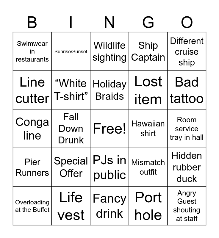This bingo card has a free space and 39 words: Door Decorations, Socks and Sandals, Lobster, “White T-shirt”, Overloading at the Buffet, PJs in public, Holiday Braids, Family matching outfits, Different cruise ship, Pier Runners, Fall Down Drunk, Ship Captain, Angry Guest shouting at staff, Room service tray in hall, Hawaiian shirt, Special Offer, Unattended children, Swimwear in restaurants, Slippers in public, Mismatch outfit, Line cutter, Fancy drink, Lost item, Bad tattoo, Bored staff member, People using selfie stick, Kid crying, Woman in high heels, Bare feet, Sunrise/Sunset, Formal attire, Anchor, Wildlife sighting, Life vest, Port hole, Ships wheel, Hidden rubber duck, Conga line and Someone asleep.