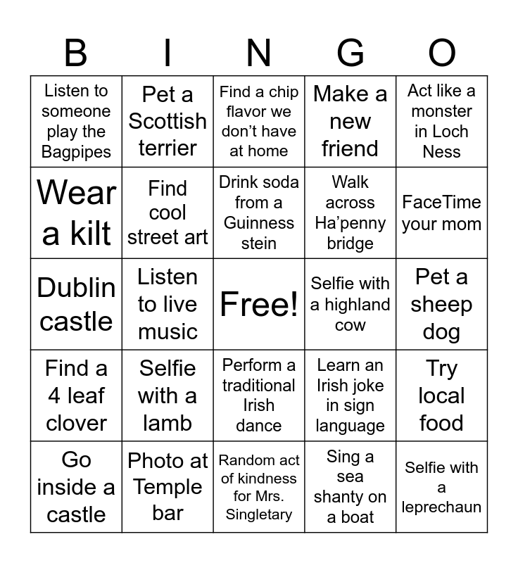 This bingo card has a free space and 24 words: Selfie with a lamb, Photo at Temple bar, Drink soda from a Guinness stein, Go inside a castle, Act like a monster in Loch Ness, Listen to someone play the Bagpipes, Wear a kilt, Pet a Scottish terrier, Selfie with a highland cow, Perform a traditional Irish dance, Walk across Ha’penny bridge, Dublin castle, Learn an Irish joke in sign language, Try local food, Find cool street art, Sing a sea shanty on a boat, Pet a sheep dog, Find a chip flavor we don’t have at home, FaceTime your mom, Listen to live music, Selfie with a leprechaun, Find a 4 leaf clover, Make a new friend and Random act of kindness for Mrs. Singletary.