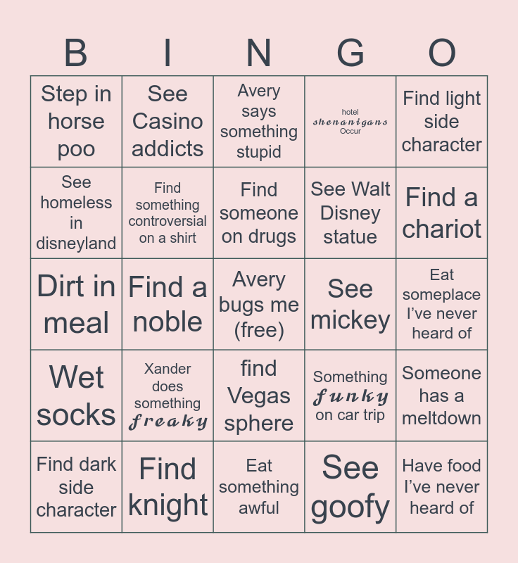 This bingo card has a free space and 24 words: Xander does something 𝓯𝓻𝓮𝓪𝓴𝔂, Find knight, Find someone on drugs, Find dark side character, Find light side character, Step in horse poo, See homeless in disneyland, See Casino addicts, See mickey, find Vegas sphere, See Walt Disney statue, Dirt in meal, Something 𝓯𝓾𝓷𝓴𝔂 on car trip, Someone has a meltdown, Find something controversial on a shirt, See goofy, Eat someplace I’ve never heard of, Avery says something stupid, Find a chariot, Find a noble, Have food I’ve never heard of, Wet socks, hotel 𝓼𝓱𝓮𝓷𝓪𝓷𝓲𝓰𝓪𝓷𝓼 Occur and Eat something awful.