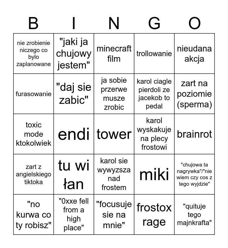 This bingo card has 25 words: tu wi łan, "focusuje sie na mnie", ja sobie przerwe musze zrobic, "no kurwa co ty robisz", nieudana akcja, nie zrobienie niczego co bylo zaplanowane, furasowanie, "jaki ja chujowy jestem", karol wyskakuje na plecy frostowi, karol sie wywyzsza nad frostem, karol ciagle pierdoli ze jacekob to pedal, toxic mode ktokolwiek, miki, "chujowa ta nagrywka"/"nie wiem czy cos z tego wyjdzie", "daj sie zabic", "quituje tego majnkrafta", brainrot, minecraft film, zart na poziomie (sperma), endi, tower, "0xxe fell from a high place", zart z angielskiego tiktoka, trollowanie and frostox rage.