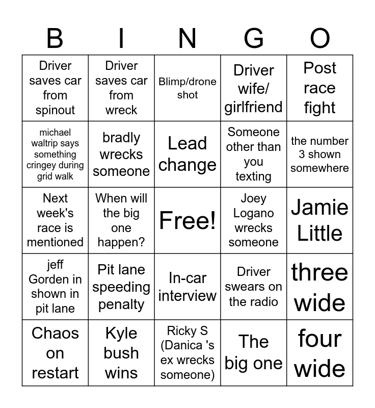 This bingo card has a free space and 24 words: Pit lane speeding penalty, Kyle bush wins, Lead change, Chaos on restart, Post race fight, Driver saves car from spinout, michael waltrip says something cringey during grid walk, Driver saves car from wreck, Joey Logano wrecks someone, In-car interview, Someone other than you texting, Next week's race is mentioned, Driver swears on the radio, three wide, bradly wrecks someone, The big one, Jamie Little, Blimp/drone shot, the number 3 shown somewhere, When will the big one happen?, four wide, jeff Gorden in shown in pit lane, Driver wife/ girlfriend and Ricky S (Danica 's ex wrecks someone).