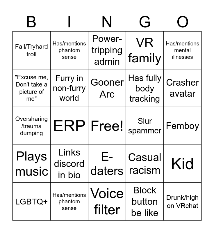 This bingo card has a free space and 24 words: Links discord in bio, Has/mentions phantom sense, Gooner Arc, LGBTQ+, Has/mentions mental illnesses, Fail/Tryhard troll, "Excuse me, Don't take a picture of me", Has/mentions phantom sense, Slur spammer, E-daters, Has fully body tracking, Oversharing /trauma dumping, Casual racism, Kid, Furry in non-furry world, Block button be like, Femboy, Power-tripping admin, Crasher avatar, ERP, Drunk/high on VRchat, Plays music, VR family and Voice filter.