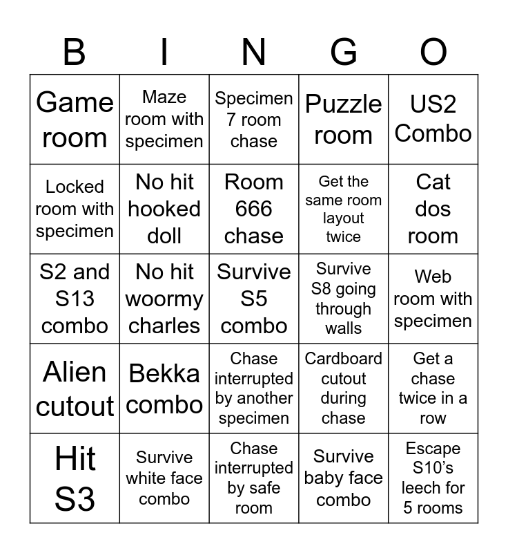 This bingo card has 25 words: Bekka combo, Chase interrupted by safe room, Room 666 chase, Hit S3, US2 Combo, Game room, Locked room with specimen, Maze room with specimen, Survive S8 going through walls, Chase interrupted by another specimen, Get the same room layout twice, S2 and S13 combo, Cardboard cutout during chase, Get a chase twice in a row, No hit hooked doll, Escape S10’s leech for 5 rooms, Web room with specimen, Specimen 7 room chase, Cat dos room, No hit woormy charles, Survive S5 combo, Survive white face combo, Alien cutout, Puzzle room and Survive baby face combo.