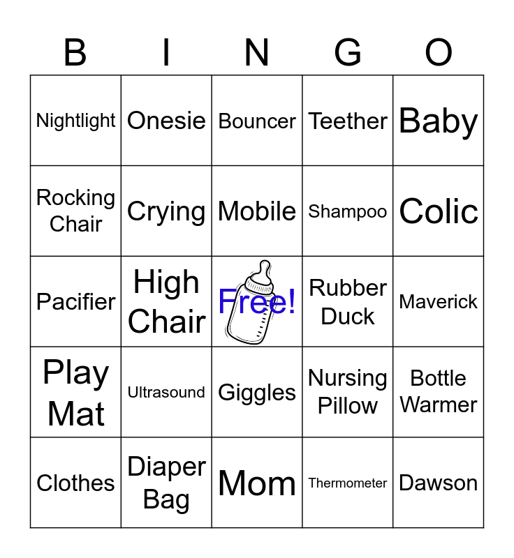 This bingo card has a free space and 74 words: Crib, Mittens, Bouncer, Sippy Cup, Baby Monitor, Blanket, Diaper Cream, Bath Tub, Clothes, Wipes, Stroller, Love, Mobile, Rocking Chair, Formula, High Chair, Socks, Colic, Milk, Pacifier, Crying, Onesie, Teether, Lullaby, Dawson, Playpen, Humidifier, Burp Cloth, Nap Time, Jumper, Baby, Towel, Changing Table, Fussy, Rattle, Thermometer, Nursery Rhyme, Bibs, Snuggle, Walker, Mom, Diaper Bag, Blue, Swing, Baby Powder, Nightlight, Bassinet, Ultrasound, Family, Teddy Bear, Sterilizer, Cradle, Maverick, Registry, Brother, Due Date, Giggles, Baby Carrier, Wash Cloth, Bottle Warmer, Shampoo, Baby Food, Play Mat, Swaddle, Rubber Duck, Bath, Bottle, Dad, Nursing Pillow, Toy Box, Sleep Sack, Stork, Crawl and Baby Gate.