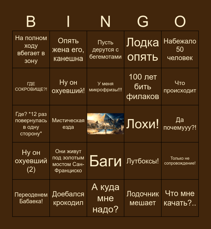 This bingo card has a free space and 24 words: Они живут под золотым мостом Сан-Франциско, Доебался крокодил, У меня микрофризы!!!, Переоденем Бабаека!, Набежало 50 человек, На полном ходу вбегает в зону, ГДЕ СОКРОВИЩЕ?!, Опять жена его, канешна, Лохи!, Баги, 100 лет бить филаков, Где? *12 раз повернулась в одну сторону*, Лутбоксы!, Только не сопровождение!, Ну он охуевший!, Лодочник мешает, Да почемууу?!, Пусть дерутся с бегемотами, Что происходит, Мистическая езда, Что мне качать?.., Ну он охуевший (2), Лодка опять and А куда мне надо?.