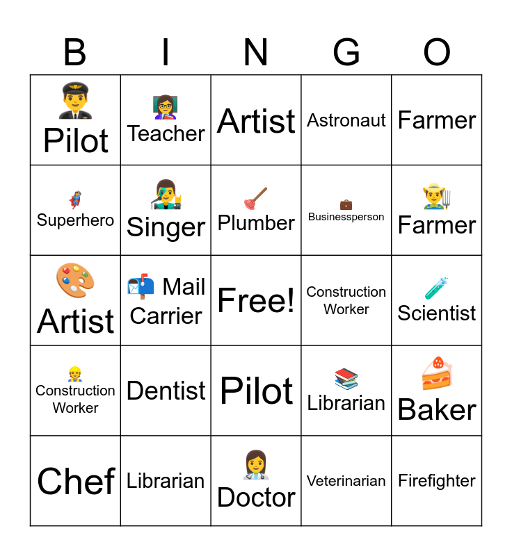 This bingo card has a free space and 44 words: Doctor, Firefighter, Teacher, Chef, Police Officer, Veterinarian, Artist, Scientist, Farmer, Librarian, Astronaut, Construction Worker, Pilot, Dentist, Musician, ๐ฉโโ๏ธ Doctor, ๐จโ๐ Firefighter, ๐จ Artist, ๐ฎ Police Officer, ๐จโ๐พ Farmer, ๐ฉโ๐ซ Teacher, ๐งโ๐ Astronaut, ๐ฉโ๐ณ Chef, ๐จโโ๏ธ Pilot, ๐พ Veterinarian, ๐งช Scientist, ๐ต Musician, ๐ฆท Dentist, ๐ Librarian, ๐ท Construction Worker, ๐ Dancer, ๐ฐ Baker, ๐ ๏ธ Engineer, ๐ฆ Zookeeper, ๐ฌ Mail Carrier, ๐ง Mechanic, ๐ญ Actor, ๐ธ Photographer, ๐ช Plumber, ๐ฆธโโ๏ธ Superhero, ๐ผ Businessperson, ๐งโ๐ณ Baker, ๐จโ๐ค Singer and Professional sports player.