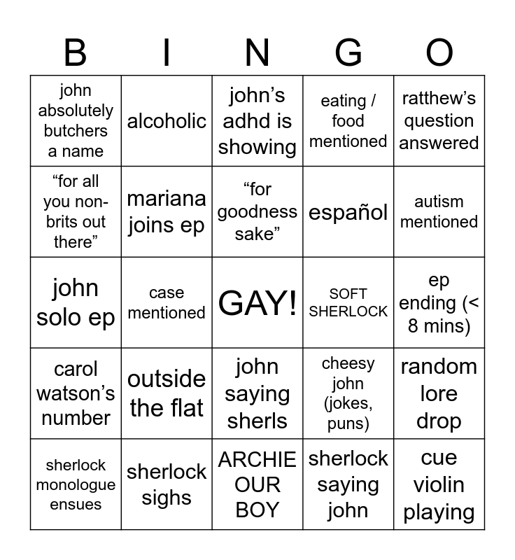 This bingo card has a free space and 24 words: outside the flat, sherlock sighs, “for goodness sake”, sherlock monologue ensues, ratthew’s question answered, john absolutely butchers a name, “for all you non-brits out there”, alcoholic, SOFT SHERLOCK, john saying sherls, español, john solo ep, cheesy john (jokes, puns), random lore drop, mariana joins ep, sherlock saying john, ep ending (< 8 mins), john’s adhd is showing, autism mentioned, case mentioned, cue violin playing, carol watson’s number, eating / food mentioned and ARCHIE OUR BOY.