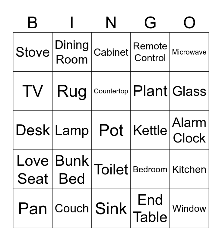 This bingo card has 61 words: Free!, Couch, Recliner, Love Seat, End Table, Coffee Table, Rug, Fireplace, Plant, Armchair, Remote Control, Blanket, TV, Living Room, Toaster, Stove, Pot, Microwave, Fridge, Countertop, Kettle, Cabinet, Pan, Kitchen, Plate, Spoon, Napkin, Cup, Glass, Chair, Dining Table, Fork, Knife, Bowl, Dining Room, Bookcase, Poster, Lamp, Hanger, Desk, Closet, Bunk Bed, Alarm Clock, Bed, Bedroom, Towel Rack, Towel, Toothbrush, Toilet Paper, Toilet, Sink, Bathtub, Bath mat, Mirror, Shower Curtain, Toothpaste, Soap, Brush, Bathroom, Window and Curtains.