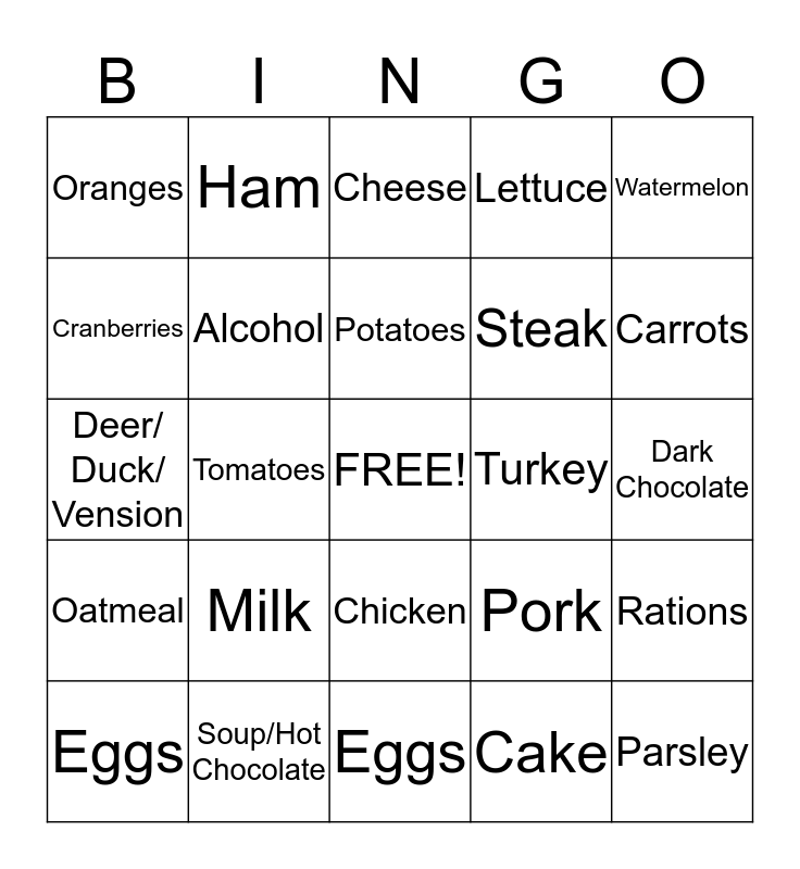 This bingo card has a free space and 24 words: Milk, Soup/Hot Chocolate, Potatoes, Eggs, Watermelon, Oranges, Cranberries, Ham, Turkey, Chicken, Steak, Deer/ Duck/ Vension, Pork, Rations, Alcohol, Cake, Dark Chocolate, Cheese, Carrots, Tomatoes, Parsley, Oatmeal, Lettuce and Eggs.