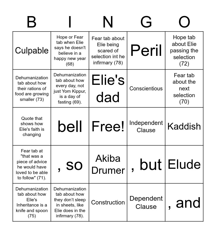 This bingo card has a free space and 24 words: , so, Dehumanization tab about how they don’t sleep in sheets, like Elie does in the infirmary (78)., Elie's dad, Dehumanization tab about how Elie's Inheritance is a knife and spoon (75), Hope tab about Elie passing the selection (72), Culpable, Dehumanization tab about how their rations of food are growing smaller (73), Hope or Fear tab when Elie says he doesn't believe in a happy new year (68), Independent Clause, Akiba Drumer, Conscientious, Quote that shows how Elie's faith is changing, , but, Elude, Dehumanization tab about how every day, not just Yom Kippur, is a day of fasting (69)., Dependent Clause, Kaddish, Fear tab about Elie being scared of selection int he infirmary (78), Fear tab about the next selection (70), bell, , and, Fear tab at "that was a piece of advice he would have loved to be able to follow" (71)., Peril and Construction.