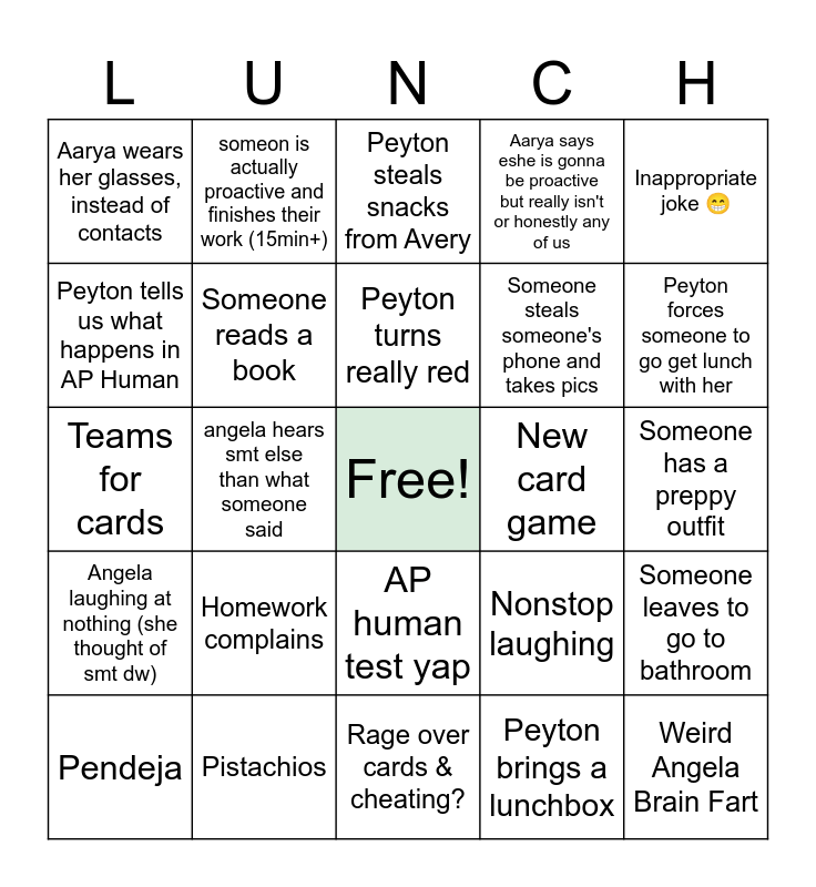 This bingo card has a free space and 44 words: Avery cackle x5, Weird Angela Brain Fart, Ur mom joke, Pendeja, Angela says smt racist, Peyton brings a lunchbox, Peyton steals snacks from Avery, Admin comes around with trash, Inappropriate joke 😁, Pistachios, Aarya says eshe is gonna be proactive but really isn't or honestly any of us, New card game, AP human test yap, Homework complains, Singing Disney Music, Rage over cards & cheating?, Collective OOOs, Teams for cards, "Take your **** take her for a trip", Peyton forces someone to go get lunch with her, someon is actually proactive and finishes their work (15min+), Games on phone, Aarya steals an Avery snack, Aarya wears her glasses, instead of contacts, Aarya wears her contacts, Someone has a preppy outfit, Someone pulls out their computer to work on smt, Ryenne side eys us bc were being weird, Nonstop laughing, Angela laughing at nothing (she thought of smt dw), Boy drama, Someone leaves to go to bathroom, Someone leaves but we dont know where they went, vending machines, angela hears smt else than what someone said, Someone brings smt diff to share with all, Aarya or Angela gets school lunch, Someone gets all four kings, Peyton turns really red, Peyton tells us what happens in AP Human, Someone steals someone's phone and takes pics, someone is absent, Someone reads a book and were all talking at the same time.