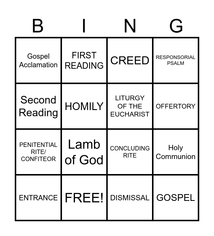 This bingo card has 28 words: GLORIA, Homily, PENITENTIAL RITE/ CONFITEOR, EUCHARISTIC PRAYER, HOMILY, CREED, FIRST READING, GOSPEL, FREE!, Our Father, CONCLUDING RITE, RESPONSORIAL PSALM, PRAYERS OF THE FAITHFUL, The COLLECT, Lamb of God, Sign of peace, LITURGY OF THE WORD, LITURGY OF THE EUCHARIST, OFFERTORY, SECOND READING, Gospel Acclamation, Greeting, ENTRANCE, Holy Communion, DISMISSAL, Sending forth, Second Reading and Transubstantiation.
