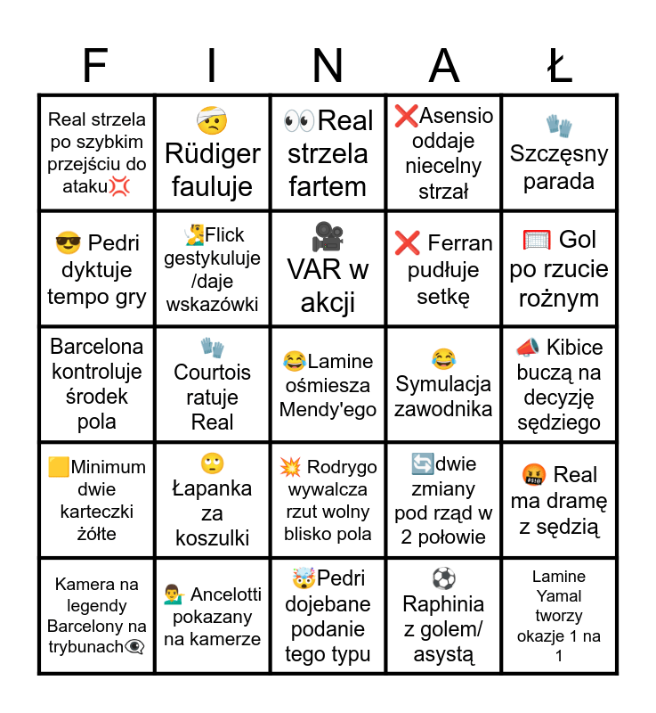 This bingo card has a free space and 24 words: 🙄Łapanka za koszulki, 💁♂️ Ancelotti pokazany na kamerze, 🎥 VAR w akcji, Kamera na legendy Barcelony na trybunach👁🗨, 🧤Szczęsny parada, Real strzela po szybkim przejściu do ataku💢, 😎 Pedri dyktuje tempo gry, 🤕 Rüdiger fauluje, 😂 Symulacja zawodnika, 💥 Rodrygo wywalcza rzut wolny blisko pola, ❌ Ferran pudłuje setkę, Barcelona kontroluje środek pola, 🔄dwie zmiany pod rząd w 2 połowie, 🤬 Real ma dramę z sędzią, 🧏♂️Flick gestykuluje /daje wskazówki, ⚽ Raphinia z golem/ asystą, 📣 Kibice buczą na decyzję sędziego, 👀Real strzela fartem, 🥅 Gol po rzucie rożnym, 🧤 Courtois ratuje Real, Lamine Yamal tworzy okazje 1 na 1, 🟨Minimum dwie karteczki żółte, ❌Asensio oddaje niecelny strzał and 🤯Pedri dojebane podanie tego typu.