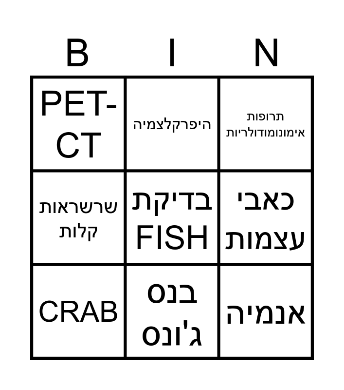 This bingo card has a free space and 11 words: חלבון M, בנס ג'ונס, אנמיה, CRAB, היפרקלצמיה, תרופות אימונומודולריות, כאבי עצמות, אי ספיקת כליות, שרשראות קלות, PET-CT and סטרואידים.