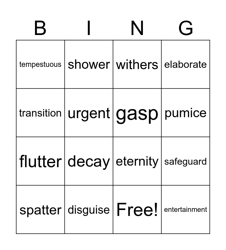 This bingo card has 17 words: Free!, spatter, withers, tempestuous, decay, elaborate, safeguard, gasp, pumice, urgent, disguise, eternity, transition, shower, flutter, performer and entertainment.