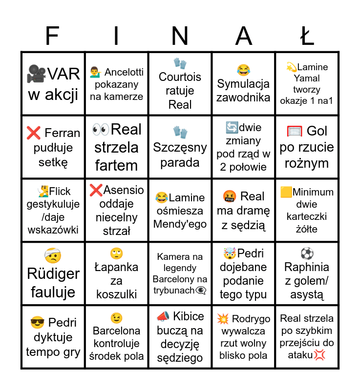 This bingo card has a free space and 24 words: 🙄Łapanka za koszulki, 😉Barcelona kontroluje środek pola, 🧤Szczęsny parada, 😎 Pedri dyktuje tempo gry, 💫Lamine Yamal tworzy okazje 1 na1, 🎥VAR w akcji, ❌ Ferran pudłuje setkę, 💁♂️ Ancelotti pokazany na kamerze, 🤬 Real ma dramę z sędzią, Kamera na legendy Barcelony na trybunach👁🗨, 🔄dwie zmiany pod rząd w 2 połowie, 🧏♂️Flick gestykuluje /daje wskazówki, 🤯Pedri dojebane podanie tego typu, ⚽Raphinia z golem/ asystą, 👀Real strzela fartem, 💥 Rodrygo wywalcza rzut wolny blisko pola, 🟨Minimum dwie karteczki żółte, 🧤Courtois ratuje Real, 🥅 Gol po rzucie rożnym, ❌Asensio oddaje niecelny strzał, Real strzela po szybkim przejściu do ataku💢, 🤕Rüdiger fauluje, 😂Symulacja zawodnika and 📣 Kibice buczą na decyzję sędziego.