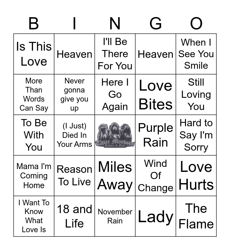 This bingo card has a free space and 57 words: Every Rose Has Its Thorn, I Want To Know What Love Is, Alone, Is This Love, November Rain, Nothing's gonna change my love for you, Never gonna give you up, Don't Know What You Got (Till It's Gone), Love Bites, I'd Do Anything For Love (But I Won't Do That), Heaven, Keep on Loving You, Always, Open Arms, Home Sweet Home, Think twice, When I See You Smile, (I Just) Died In Your Arms, Love Song, The Flame, Purple Rain, Dream On, Wind Of Change, I'll Be There For You, Can't Fight This Feeling, Here I Go Again, Silent Lucidity, Broken Wings, Still Loving You, Amanda, Never Say Goodbye, Patience, (Everything I Do) I Do It For You, Waiting for a Girl like You, Hard to Say I'm Sorry, More Than Words Can Say, Angel, To Be With You, What It Takes, Mama I'm Coming Home, Heaven, Miles Away, Love Walked In, Carrie, I Won't Hold You Back, Fly To The Angels, Reason To Live, 18 and Life, Glory Of Love, High Enough, The Smile Has Left Your Eyes, Lady, I Ain't No Nice Guy, Goodbye To Romance, Your Wildest Dreams, Love Hurts and Throwing It All Away.