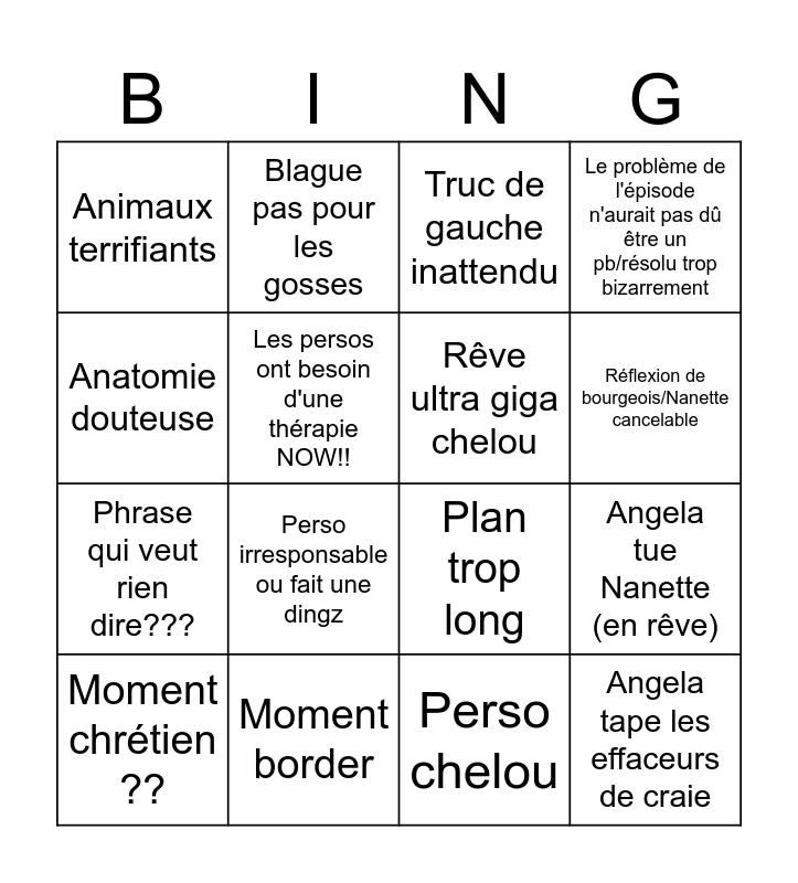 This bingo card has 16 words: Moment border, Angela tue Nanette (en rêve), Truc de gauche inattendu, Animaux terrifiants, Phrase qui veut rien dire???, Blague pas pour les gosses, Plan trop long, Perso chelou, Anatomie douteuse, Les persos ont besoin d'une thérapie NOW!!, Moment chrétien ??, Le problème de l'épisode n'aurait pas dû être un pb/résolu trop bizarrement, Perso irresponsable ou fait une dingz, Réflexion de bourgeois/Nanette cancelable, Rêve ultra giga chelou and Angela tape les effaceurs de craie.