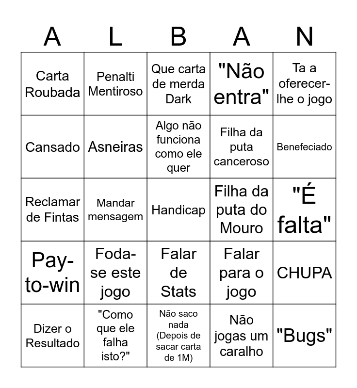 This bingo card has a free space and 27 words: Falar para o jogo, Berros atoa, Filha da puta canceroso, Não saco nada (Depois de sacar carta de 1M), Cansado, Que carta de merda Dark, Penalti Mentiroso, Pay-to-win, Filha da puta do Mouro, CHUPA, Reclamar de Fintas, "Não entra", Dizer o Resultado, "Como que ele falha isto?", Benefeciado, Que merda de gameplay, Asneiras, Algo não funciona como ele quer, Foda-se este jogo, Carta Roubada, "É falta", Não jogas um caralho, Mandar mensagem, "Bugs", Falar de Stats, Ta a oferecer-lhe o jogo and Falar de Piroca.