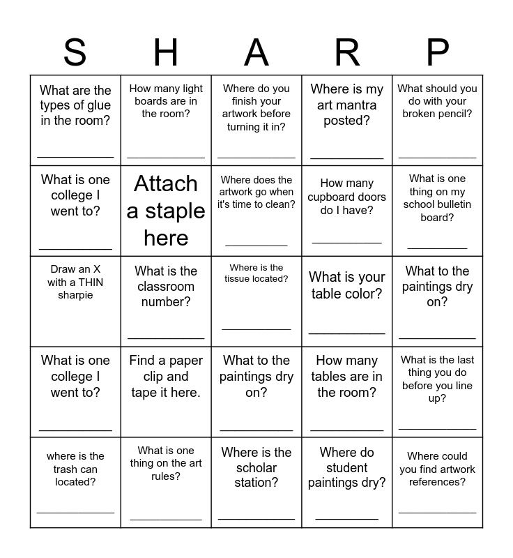 This bingo card has 46 words: With Scissors, cut a line through this box., Where is the tissue located? _____________, How do you spell my last name? ______________, Where is the scholar station? ___________, Find a paper clip and tape it here., Make a thumbprint with ink here., How many light boards are in the room? _____________, Where are my Still-Life's located? __________, What is one college I went to? __________, draw a blue x with a marker, Attach a staple here, Where is my art mantra posted? __________, What is the last thing you do before you line up? _____________, How many tables are in the room? __________, What is one type of art you did this year? ___________, How many chairs are in the room? ___________, Where does the artwork go when it's time to clean? ___________, What is your table color? __________, Draw a red X with a pencil, What should you do with your broken pencil? _____________, What is the classroom number? ___________, Where do student paintings dry? _________, What are the types of glue in the room? ___________, How many cupboard doors do I have? ___________, Put a piece of tape here, What is one thing on my school bulletin board? __________, where is the trash can located? _____________, What is my favorite type of art? ___________, What to the paintings dry on? __________, What is one college I went to? __________, Where can you you find the LO & DOL? ____________, What is in the room that's my favorite color? _______________, How do you spell my last name? _________, How many cupboard doors do I have? ___________, What is one type of art we did this year? ___________, What is one thing on the art rules? ____________, What to the paintings dry on? ___________, Where do you you find the daily agenda? ____________, How do you spell my last name? ___________, Use a glue stick here to stick a square of colored paper, Where could you find artwork references? _____________, Where do you finish your artwork before turning it in? _____________, Draw an X with a THIN sharpie, Where do we leave our artwork when were cleaning up? ___________, What is one type of art we did this year? ___________ and How many chairs are in the room? ___________.