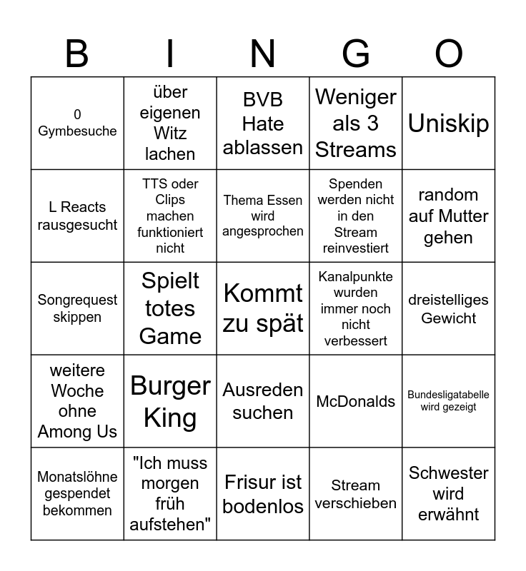 This bingo card has a free space and 24 words: Burger King, "Ich muss morgen früh aufstehen", Thema Essen wird angesprochen, Monatslöhne gespendet bekommen, Uniskip, 0 Gymbesuche, L Reacts rausgesucht, über eigenen Witz lachen, Kanalpunkte wurden immer noch nicht verbessert, Ausreden suchen, Spenden werden nicht in den Stream reinvestiert, Songrequest skippen, McDonalds, Bundesligatabelle wird gezeigt, TTS oder Clips machen funktioniert nicht, Stream verschieben, dreistelliges Gewicht, BVB Hate ablassen, random auf Mutter gehen, Spielt totes Game, Schwester wird erwähnt, weitere Woche ohne Among Us, Weniger als 3 Streams and Frisur ist bodenlos.