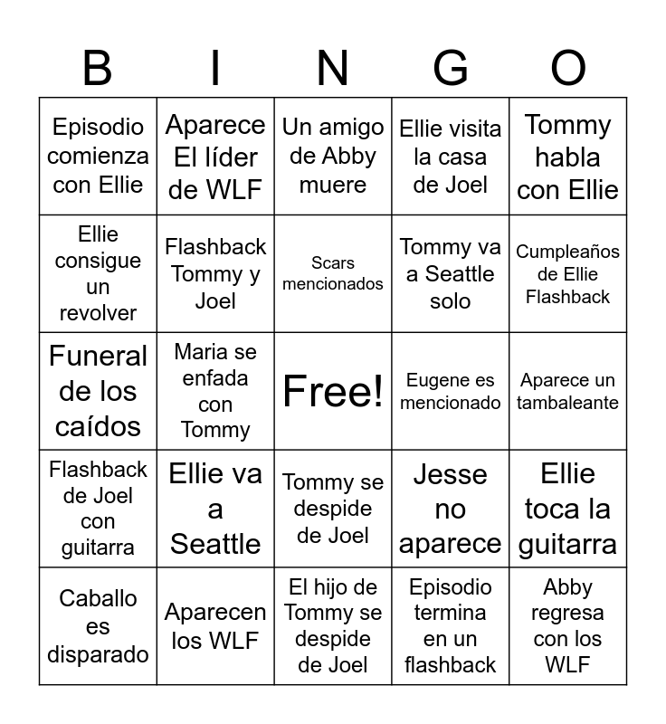 This bingo card has a free space and 24 words: Ellie va a Seattle, Aparecen los WLF, Scars mencionados, Caballo es disparado, Tommy habla con Ellie, Episodio comienza con Ellie, Ellie consigue un revolver, Aparece El líder de WLF, Eugene es mencionado, Tommy se despide de Joel, Tommy va a Seattle solo, Funeral de los caídos, Jesse no aparece, Ellie toca la guitarra, Flashback Tommy y Joel, Episodio termina en un flashback, Aparece un tambaleante, Un amigo de Abby muere, Cumpleaños de Ellie Flashback, Maria se enfada con Tommy, Abby regresa con los WLF, Flashback de Joel con guitarra, Ellie visita la casa de Joel and El hijo de Tommy se despide de Joel.