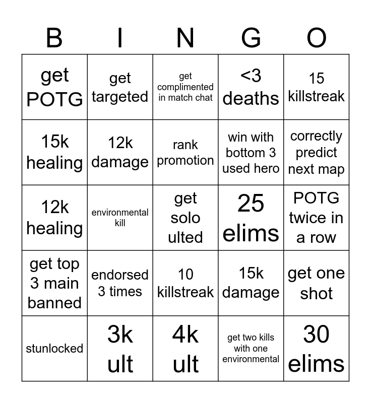 This bingo card has 38 words: 10+ deaths, rank promotion, win as sigma, 12k damage, get one shot, endorsed 3 times, rank promotion, get teabagged, 15 killstreak, win with bottom 3 used hero, environmental kill, <3 deaths, get solo ulted, POTG twice in a row, 15k healing, get top 3 main banned, get both perks first, get complimented in match chat, 3 ults/3 characters, 25 elims, get POTG, 3k ult, correctly predict next map, stunlocked, win as kiriko, 4k ult, 30 elims, endorsed 4 times, win as sombra, <4 deaths, win as junker queen, 10 killstreak, get two kills with one environmental, get targeted, get solo ulted in every round, 15k damage, 12k healing and use your ult 3 times in one round.