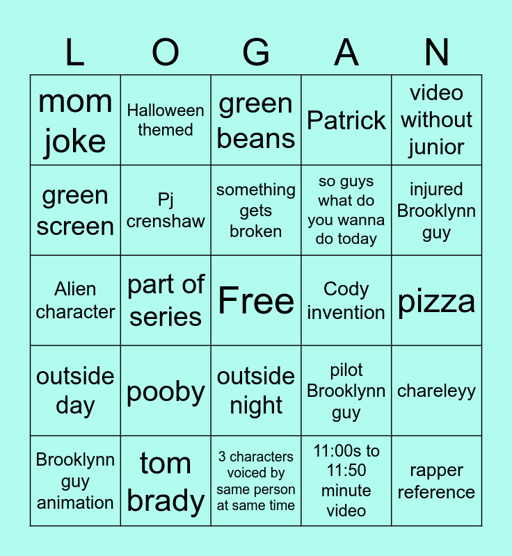 This bingo card has a free space and 49 words: Steve staleburger, rapper reference, lie, 3 characters voiced by same person at same time, pooby, any instrument, Halloween themed, Jeffy without blue helmet, green screen, chives, Pj crenshaw, Patrick, chareleyy, pilot Brooklynn guy, Cody without glasses, joseph leaving in panic, something gets broken, Cody invention, crime, video without junior, part of series, 11:00s to 11:50 minute video, mom joke, so guys what do you wanna do today, injured junior, injured Brooklynn guy, Brooklynn guy animation, Brooklynn guy movie animation, outside night, outside day, one time character (Pretty much), court scene, Huckerdoo little girl, ninety, tom brady, jimmy butler, 20 million views or more, may video, pizza, the burger king, wendy, applebees, any cat (non-puppet), Jeffy's room scene, Alien character, green beans, Cody video, superpowers video and chef pee pee pees peas.