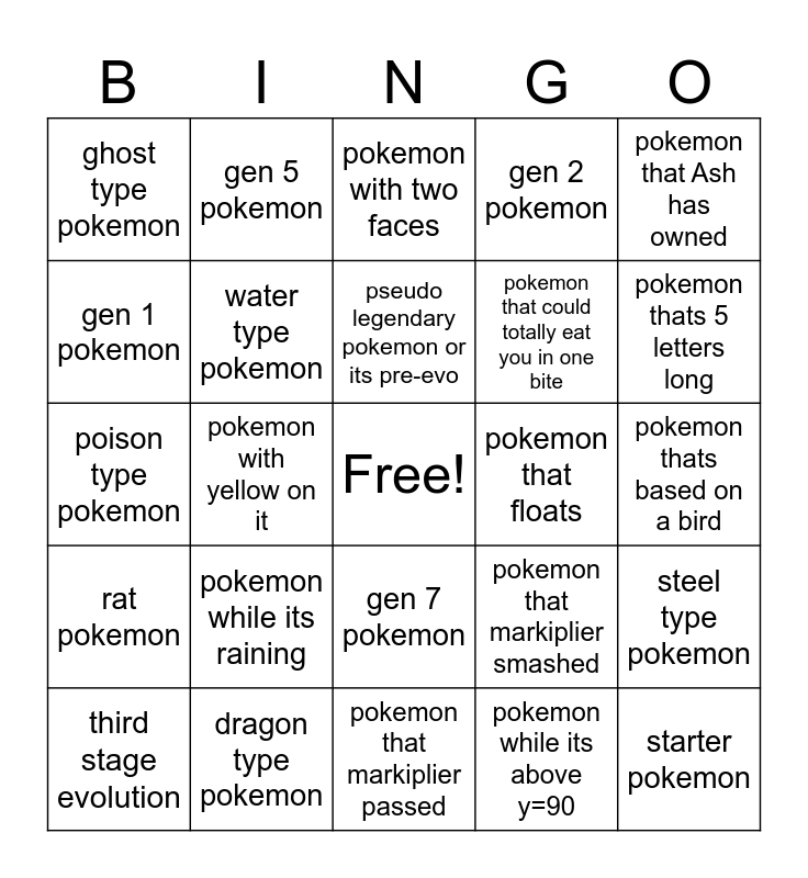 This bingo card has a free space and 29 words: third stage evolution, pokemon with one eye, pokemon with yellow on it, pokemon with no arms, ghost type pokemon, pokemon with two faces, water type pokemon, pokemon while its raining, pokemon that floats, dragon type pokemon, pokemon thats based on a bird, starter pokemon, pokemon that markiplier passed, pokemon while its above y=90, pokemon thats 5 letters long, pokemon with purple on it, gen 7 pokemon, rat pokemon, pokemon that Ash has owned, poison type pokemon, pokemon that markiplier smashed, baby pokemon, pokemon that could totally eat you in one bite, gen 1 pokemon, gen 2 pokemon, gen 5 pokemon, steel type pokemon, pseudo legendary pokemon or its pre-evo and pokemon who's name starts with the same letter as your name.