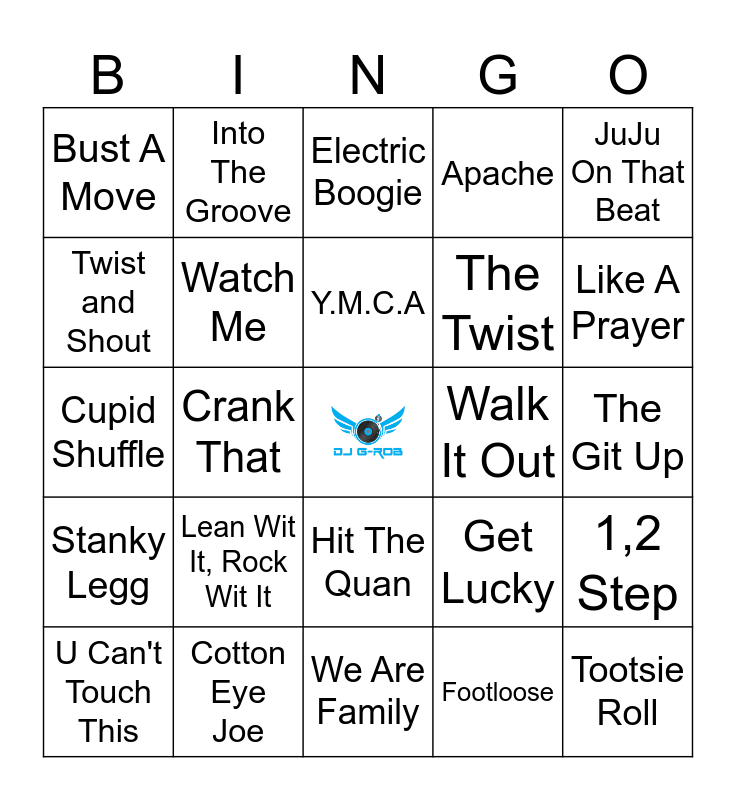 This bingo card has a free space and 40 words: Cha Cha Slide, Cupid Shuffle, Wobble, Watch Me, Cotton Eye Joe, Hit The Quan, Y.M.C.A, Macarena, JuJu On That Beat, Stanky Legg, Crank That, Apache, Tootsie Roll, The Git Up, Walk It Out, Lean Wit It, Rock Wit It, Teach Me How To Dougie, Bust A Move, Single Ladies, Electric Boogie, 1,2 Step, Footloose, The Twist, Twist and Shout, Wannabe, In My Feelings, Uptown Funk, I Wanna Dance With Somebody, Celebration, Conga, Dancing Queen, U Can't Touch This, Le Freak, Get Lucky, Like A Prayer, We Are Family, Night Fever, Shut Up And Dance, Into The Groove and Wake Me Up Before You Go-Go.