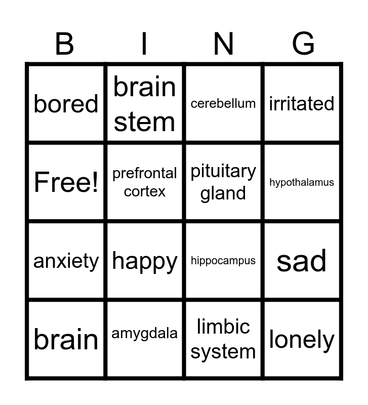 This bingo card has 16 words: amygdala, sad, cerebellum, bored, anxiety, brain stem, hippocampus, limbic system, Free!, prefrontal cortex, brain, irritated, happy, hypothalamus, pituitary gland and lonely.