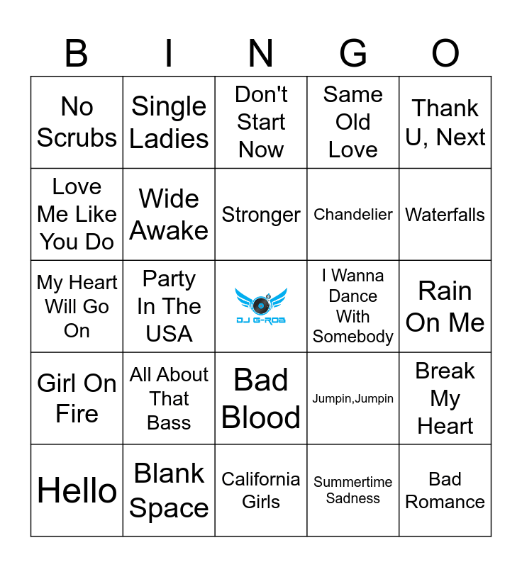 This bingo card has a free space and 40 words: Love On Top, My Heart Will Go On, We Belong Together, Wide Awake, Blank Space, Bad Blood, Stronger, Rolling In the Deep, Thank U, Next, Girl On Fire, Party In The USA, Same Old Love, Bad Romance, Rain On Me, I Wanna Dance With Somebody, All About That Bass, Like A Prayer, No Scrubs, The Boy Is Mine, Don't Start Now, Break My Heart, Summertime Sadness, Chandelier, Love Me Like You Do, I'm Real, Wannabe, Say You'll Be There, Meant To Be, What About Us, Wolves, Something In The Water, Hello, I'm A Slave, Jumpin,Jumpin, Waterfalls, California Girls, Firework, Since U Been Gone, Single Ladies and Shake It Off.