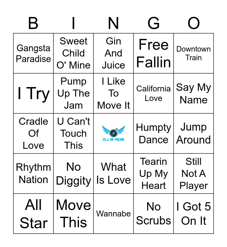 This bingo card has a free space and 41 words: Poison, Cradle Of Love, Ice Ice Baby, Pump Up The Jam, Move This, What Is Love, I Like To Move It, The Rhythm Of The Night, Downtown Train, Rhythm Nation, U Can't Touch This, Free Fallin, I Got 5 On It, Jump Around, Humpty Dance, No Diggity, Macarena, Gangsta Paradise, This Is How We Do It, Gin And Juice, Still Not A Player, Regulate, Wannabe, California Love, Larger Than Life, Livin' On A Prayer, No Scrubs, What A Girl Wants, Say My Name, Jumpin, Jumpin, Ooooops...I Did It Again, Sweet Child O' Mine, All Star, Californication, Tearin Up My Heart, I Try, I'm Real, Larger Than Life, Everybody, Yeah and How In Herre.