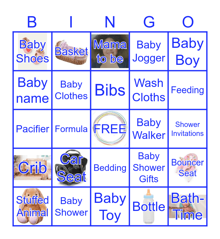 This bingo card has 22 images, a free space and 44 words: Registry, Car Seat, Baby Bath, Bottle, Milk, Baby Carrier, Baby Clothes, Baby Food, Baby Jogger, Bath-Time, Baby Shoes, Baby Shower, Baby Shower Gifts, Shower Invitations, Baby Sitter, Baby Swing, Baby Toy, Baby Walker, Teether, Pacifier, Basket, Bedding, Bassinet, Baby Boy, Mobile, Lullaby, Bibs, Booties, Bouncer Seat, Stuffed Animal, Photo Album, Mama to be, Onesies, Cradle, Crib, Diapers, Diaper Bag, Blanket, Feeding, Baby name, Formula, High Chair, Wash Cloths and Stroller.