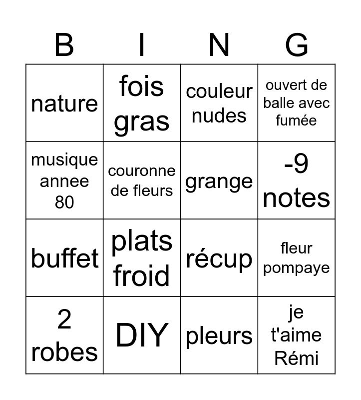 This bingo card has 16 words: DIY, fleur pompaye, couleur nudes, nature, buffet, fois gras, récup, pleurs, musique annee 80, couronne de fleurs, 2 robes, ouvert de balle avec fumée, plats froid, -9 notes, grange and je t'aime Rémi.