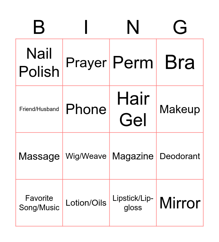 This bingo card has 37 words: Toothbrush, Hairbrush, Body wash, Hair Gel, Shampoo & Conditioner, Body Spray, Makeup, Jewelry, Friend/Husband, Bag/purse, Deodorant, Bra, Favorite Song/Music, Lipstick/Lip-gloss, Phone, Mirror, Flatiron, Perm, Hair Dryer, Lotion/Oils, Nail Polish, Wig/Weave, Hair Dye, Hair Rollers, Hot Comb, Body scrub, Prayer, Time, Singing, Earrings, Eyelashes, Wine, Magazine, Facewash, Pads/Tampons, Massage and Inspirational Quotes.