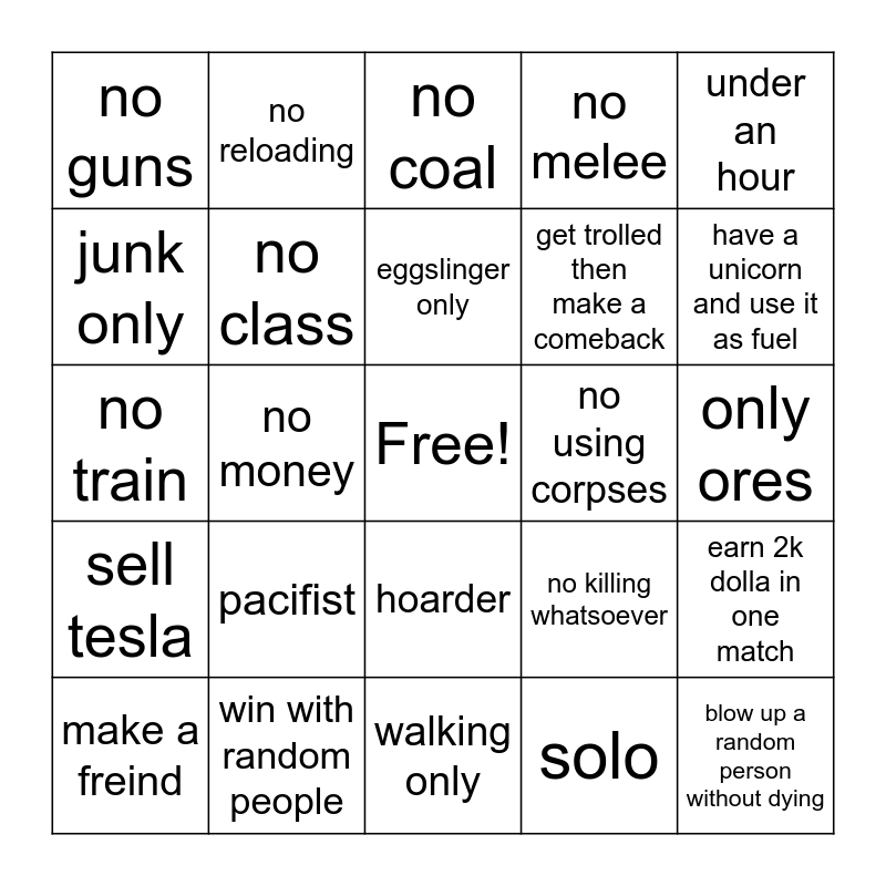 This bingo card has a free space and 24 words: pacifist, win with random people, eggslinger only, make a freind, under an hour, no guns, junk only, no reloading, no using corpses, hoarder, get trolled then make a comeback, no train, no killing whatsoever, earn 2k dolla in one match, no class, solo, only ores, no coal, have a unicorn and use it as fuel, no money, blow up a random person without dying, sell tesla, no melee and walking only.