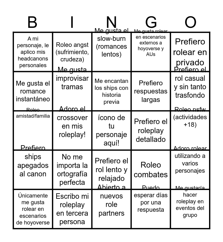 This bingo card has a free space and 24 words: No me importa la ortografía perfecta, Escribo mi roleplay en tercera persona, Me encantan los ships con historia previa, Únicamente me gusta rolear en escenarios de hoyoverse, Prefiero rolear en privado, A mi personaje, le aplico mis headcanons personales, Me gusta el romance instantáneo, Roleo angst (sufrimiento, crudeza), Prefiero el roleplay detallado, Prefiero el rol lento y relajado, Prefiero respuestas largas, Roleo amistad/familia, Roleo combates, Adoro rolear utilizando a varios personajes, Me gusta improvisar tramas, Puedo esperar días por una respuesta, Roleo nsfw (actividades +18), Me gusta el slow-burn (romances lentos), Prefiero el rol casual y sin tanto trasfondo, Adoro el crossover en mis roleplay!, Me gustaría hacer roleplay en eventos del grupo, Prefiero ships apegados al canon, Me gusta rolear en escenarios externos a hoyoverse y AUs and Abierto a nuevos role partners.