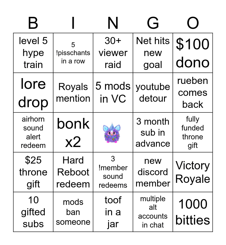 This bingo card has a free space and 24 words: 10 gifted subs, Hard Reboot redeem, 5 mods in VC, multiple alt accounts in chat, $100 dono, level 5 hype train, 5 !pisschants in a row, 30+ viewer raid, 3 month sub in advance, fully funded throne gift, airhorn sound alert redeem, Royals mention, new discord member, Victory Royale, lore drop, mods ban someone, toof in a jar, Net hits new goal, rueben comes back, $25 throne gift, bonk x2, 3 !member sound redeems, youtube detour and 1000 bitties.