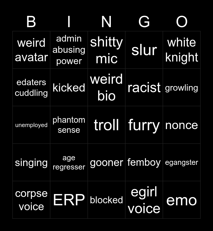 This bingo card has a free space and 24 words: age regresser, ERP, weird bio, corpse voice, white knight, weird avatar, edaters cuddling, admin abusing power, furry, gooner, racist, unemployed, femboy, egangster, kicked, egirl voice, nonce, shitty mic, growling, phantom sense, emo, singing, slur and blocked.