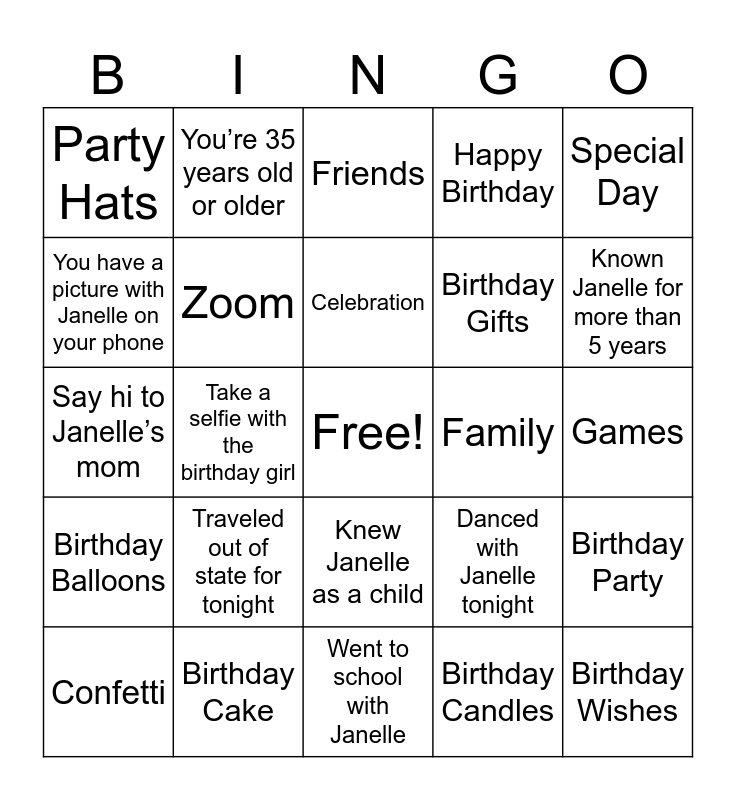 This bingo card has a free space and 58 words: Party, Birthday Cake, Birthday Boy, Birthday Balloons, Birthday Candles, Birthday, Zoom, Streamers, Birthday Gifts, Birthday Card, Happy Birthday, Party Invitations, February, Birthday Girl, Happy Returns, Party Hats, Birthday Wishes, Special Day, Phone calls, Celebration, Family, Friends, Confetti, Birthday Party, 17th, Games, Fun, Virtual games night, Known Janelle for more than 5 years, Known Janelle for more than 10 years, Stevie Wonder Happy Bday Song is Played, Ordered a Margarita, Janelle gives a toast, Meet someone new, Met one of Janelle’s school friends, Met one of Janelle’s family members, Met one of Janelle’s former coworkers, Take a selfie with the birthday girl, Say hi to Janelle’s mom, Swap a favorite Janelle story with someone, Traveled out of state for tonight, Took a train to the venue, Danced with Janelle tonight, Found someone wearing the same color as you, You know Janelle’s middle name, You’ve traveled internationally with Janelle, You’ve been to Janelle’s current apartment, Knew Janelle as a child, Went to school with Janelle, Been to Harlem, Been to Jamaica, Ordered a food item that you’ve never had before, Arrived on time!, Traveled somewhere new this year, You’re 35 years old or older, Danced to two songs, You have a picture with Janelle on your phone and Tell Janelle she’s funny.