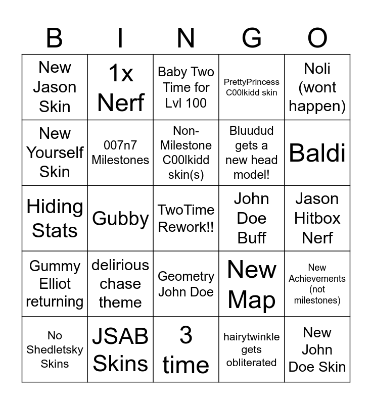This bingo card has a free space and 24 words: delirious chase theme, JSAB Skins, Non-Milestone C00lkidd skin(s), No Shedletsky Skins, Noli (wont happen), New Jason Skin, New Yourself Skin, 1x Nerf, John Doe Buff, Geometry John Doe, Bluudud gets a new head model!, Hiding Stats, New Map, New Achievements (not milestones), 007n7 Milestones, hairytwinkle gets obliterated, Jason Hitbox Nerf, Baby Two Time for Lvl 100, Baldi, Gubby, New John Doe Skin, Gummy Elliot returning, PrettyPrincess C00lkidd skin and 3 time.
