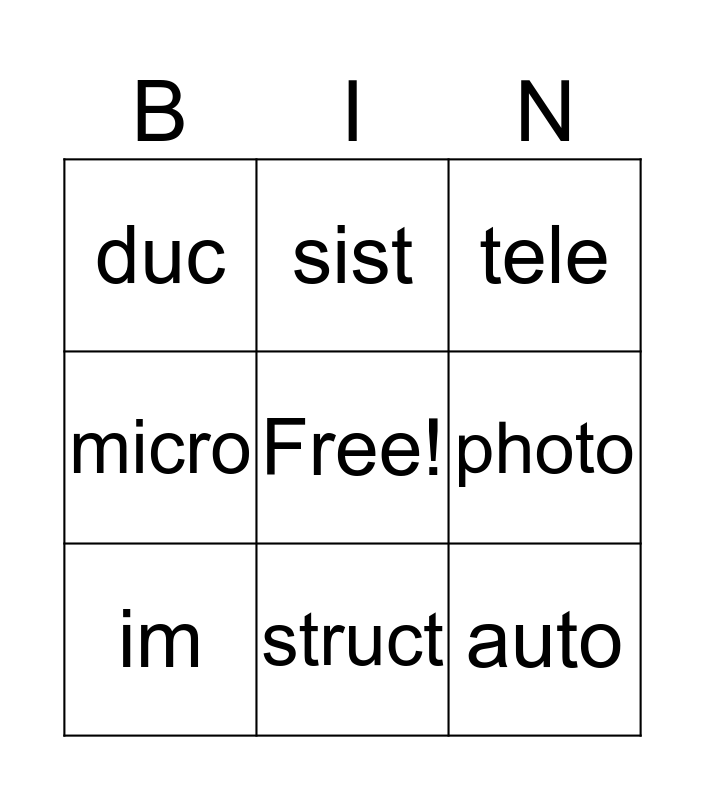 This bingo card has a free space and 11 words: hydr, struct, auto, im, sist, tele, photo, jud, micro, duc and able.