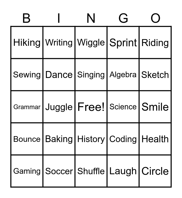 This bingo card has a free space and 24 words: Baking, Soccer, Singing, Gaming, Riding, Hiking, Sewing, Writing, Science, History, Algebra, Grammar, Coding, Health, Dance, Laugh, Smile, Wiggle, Sketch, Juggle, Circle, Bounce, Sprint and Shuffle.