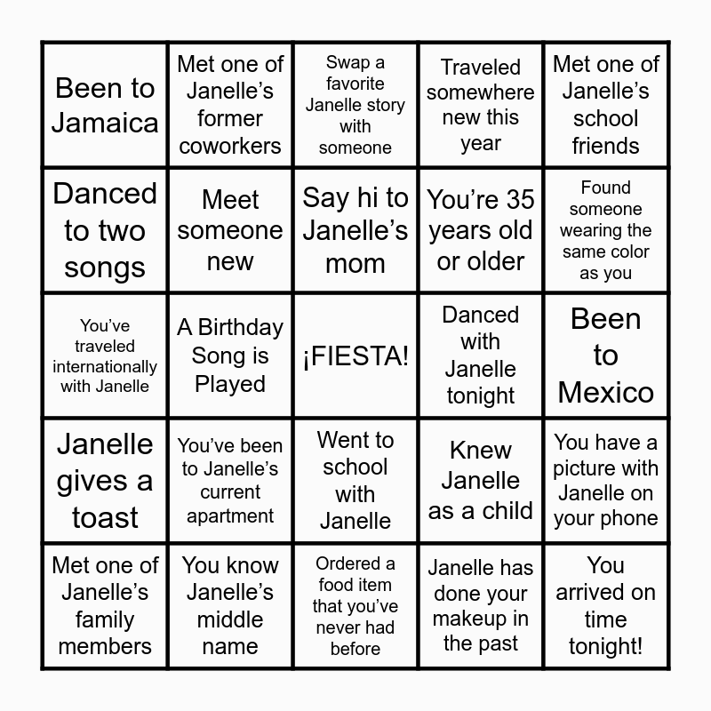 This bingo card has a free space and 33 words: Known Janelle for more than 5 years, Known Janelle for more than 10 years, A Birthday Song is Played, Ordered a Margarita, Janelle gives a toast, Meet someone new, Met one of Janelle’s school friends, Met one of Janelle’s family members, Met one of Janelle’s former coworkers, Take a selfie with the birthday girl, Say hi to Janelle’s mom, Swap a favorite Janelle story with someone, Traveled out of state for tonight, Took a train to the venue, Danced with Janelle tonight, Found someone wearing the same color as you, You know Janelle’s middle name, You’ve traveled internationally with Janelle, You’ve been to Janelle’s current apartment, Knew Janelle as a child, Went to school with Janelle, Been to Harlem, Been to Jamaica, Been to Mexico, Ordered a food item that you’ve never had before, You arrived on time tonight!, Traveled somewhere new this year, You’re 35 years old or older, Danced to two songs, You have a picture with Janelle on your phone, Tell Janelle she’s funny, Janelle has done your makeup in the past and Name 3 countries Janelle has traveled to.