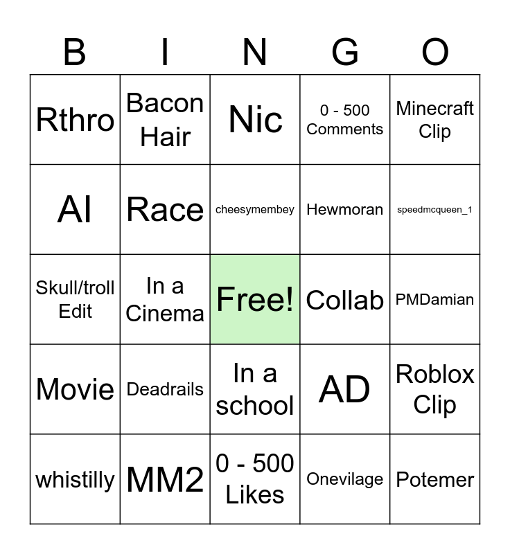 This bingo card has a free space and 24 words: whistilly, Deadrails, cheesymembey, Onevilage, Minecraft Clip, Rthro, Bacon Hair, Nic, Collab, PMDamian, Skull/troll Edit, Race, AD, Roblox Clip, AI, MM2, 0 - 500 Likes, 0 - 500 Comments, speedmcqueen_1, Movie, In a Cinema, In a school, Hewmoran and Potemer.