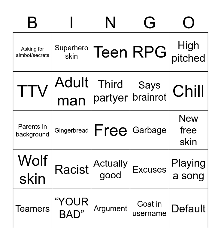 This bingo card has a free space and 24 words: Racist, “YOUR BAD”, Third partyer, Teamers, High pitched, Asking for aimbot/secrets, TTV, Superhero skin, Garbage, Actually good, Says brainrot, Parents in background, Excuses, Playing a song, Adult man, Goat in username, New free skin, Teen, Chill, Gingerbread, Default, Wolf skin, RPG and Argument.