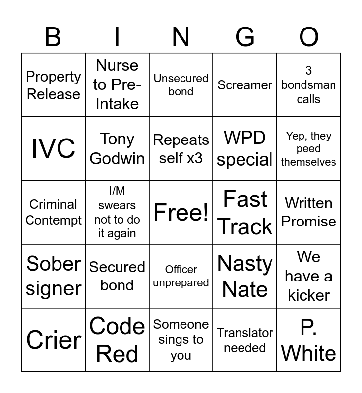 This bingo card has a free space and 24 words: Secured bond, Code Red, Repeats self x3, Crier, 3 bondsman calls, Property Release, IVC, Nurse to Pre-Intake, Fast Track, Officer unprepared, WPD special, Criminal Contempt, Nasty Nate, We have a kicker, Tony Godwin, Translator needed, Written Promise, Unsecured bond, Yep, they peed themselves, I/M swears not to do it again, P. White, Sober signer, Screamer and Someone sings to you.